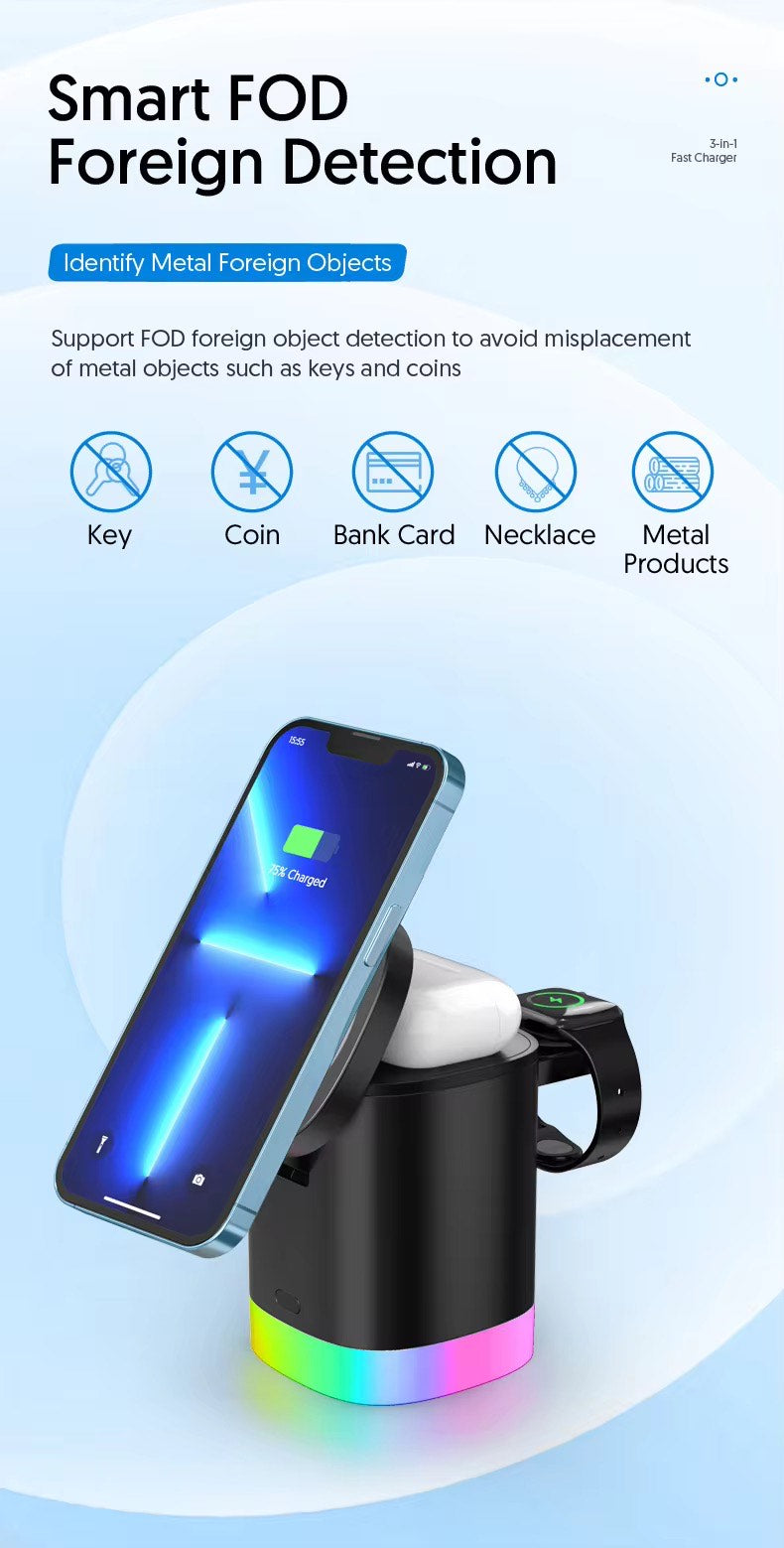 3-in-1 Charging: Supports Qi-enabled smartphones, Apple Watch, and wireless earbuds